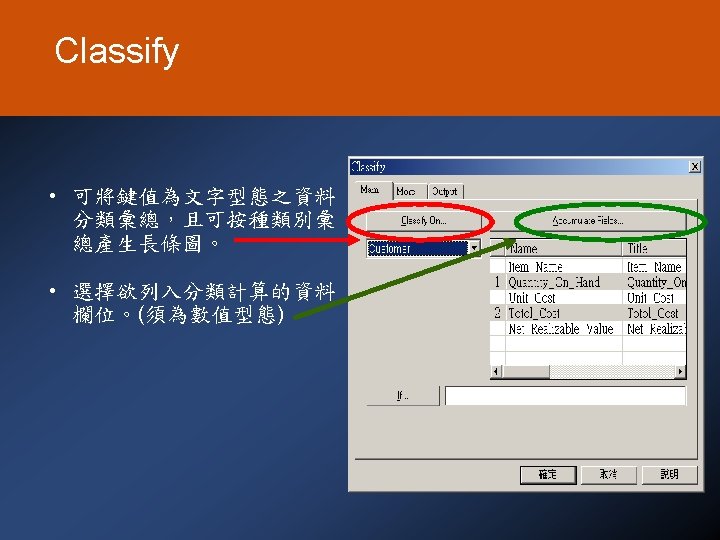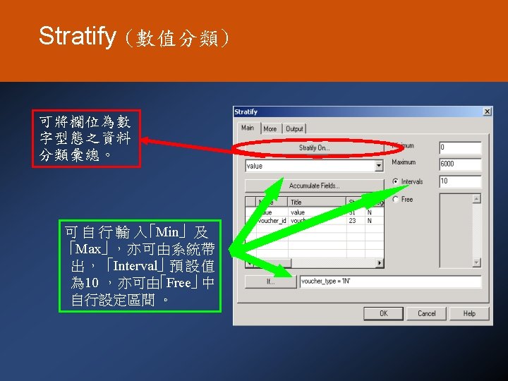 Age • Performs ageing of records based upon a selected date field; • 可自行設定Cut - Off 的 日期,且可自訂區間