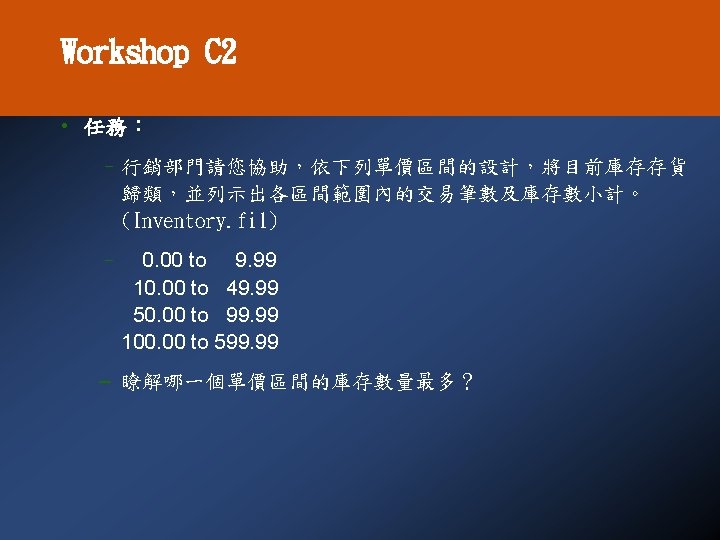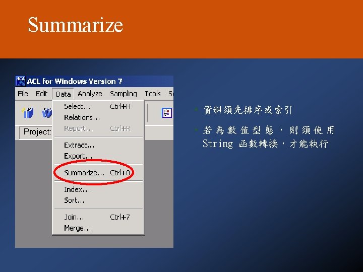 ACL Training Materials Unit C: Analysing data characteristics 主要參考資料來源: KPMG ACL課程講義資料 Price. Water. House. Cooper ACL課程講義資料