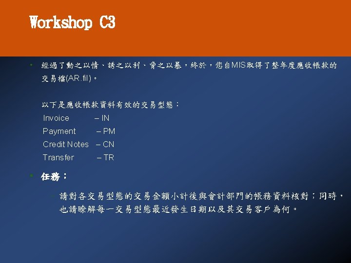 Total • See if you can derive the total value of the invoices (ie voucher type ‘IN’) that were billed before 1997 • 可驗證資料之完整性