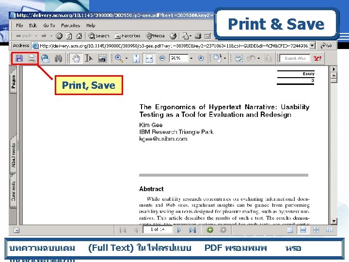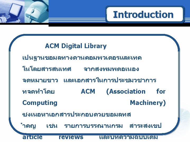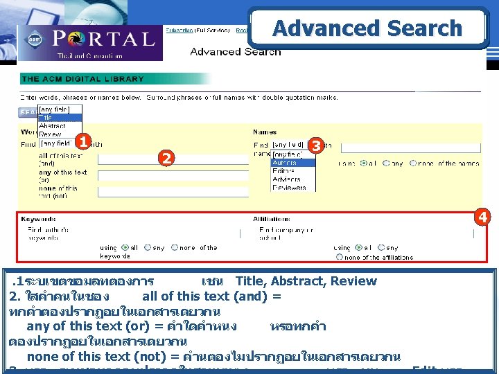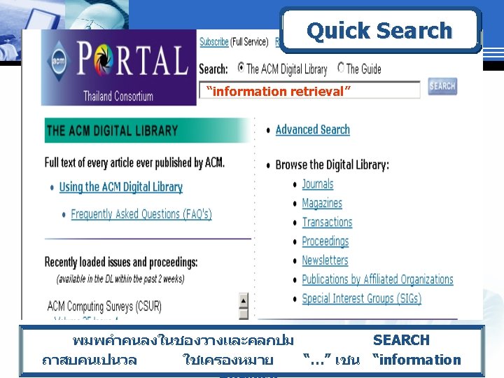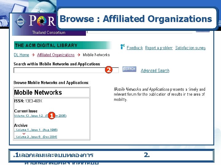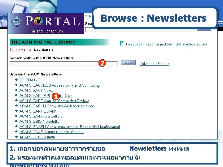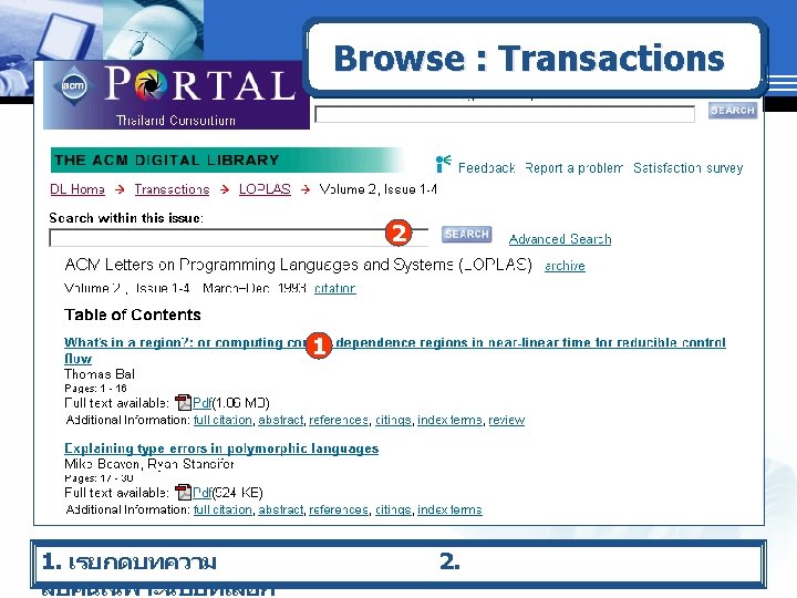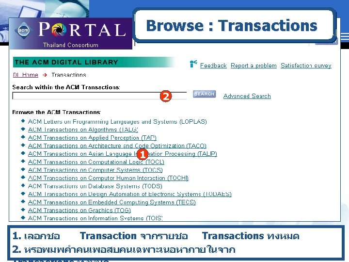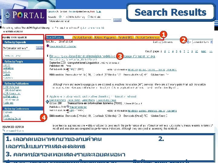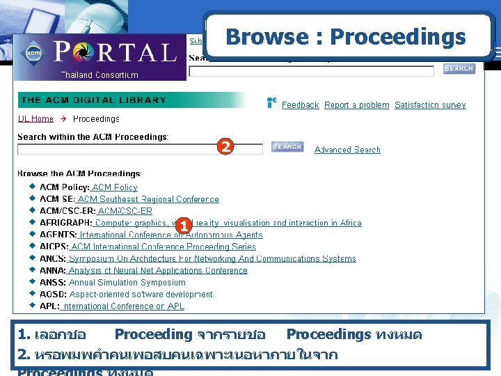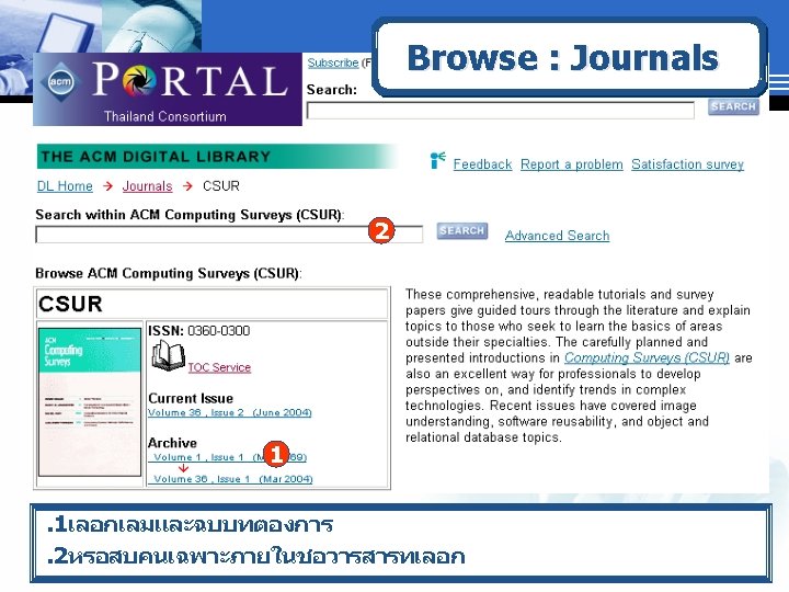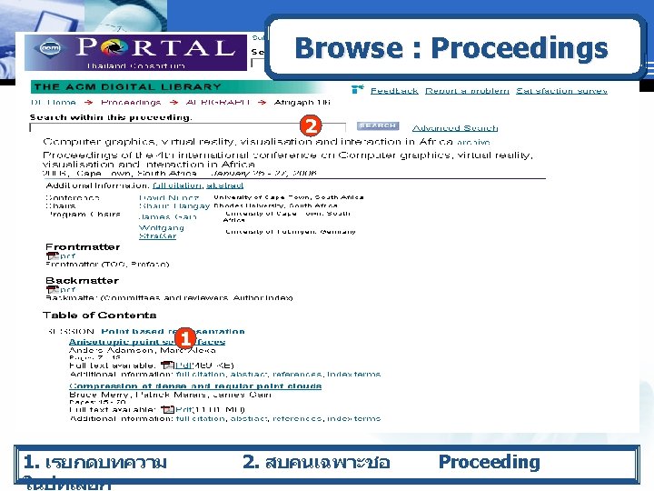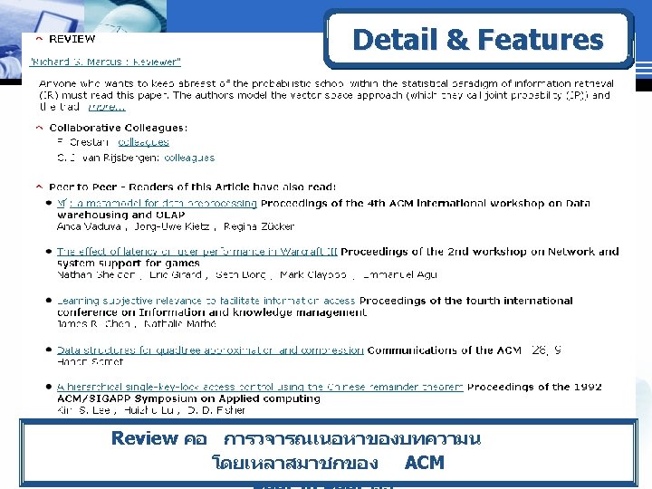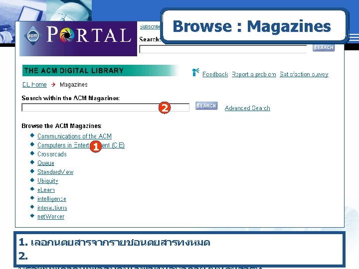ACM ACM Home Page ACM Journals Magazines Transactions Slides: 40 Download presentation สารบญ Ø ACM คออะไร Ø หนาจอหลก Ø การเขาด (ACM Home. Page) ACM ตามประเภทของสงพมพ Ø Journals Ø Magazines Ø Transactions Ø Proceedings Ø Newsletters Ø Publication by Affiliated Organizations Ø Special Interest Groups (SIGs) (Browse) Search Methods Browse the Digital Library Quick Search Advanced Search Homepage Browse : Affiliated Organizations 2 1 1. เลอกชอสงพมพ 2. Detail & Features Detail & Features Detail & Features Cross. Ref Search “stem cell” พมพคำคนและคลกปม Search