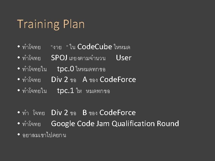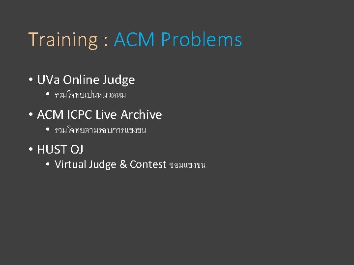 Training : CP Training (Thai) • programming. in. th • อยมานาน community ใหญ • www. programming. in. th • Code Cube • นองใหมไฟแรง • www. codecube. in. th • Thailand Programming Contest • นองไมใหมไฟไมคอยแรง (คนทำงานยง • contest. thailandoi. org (