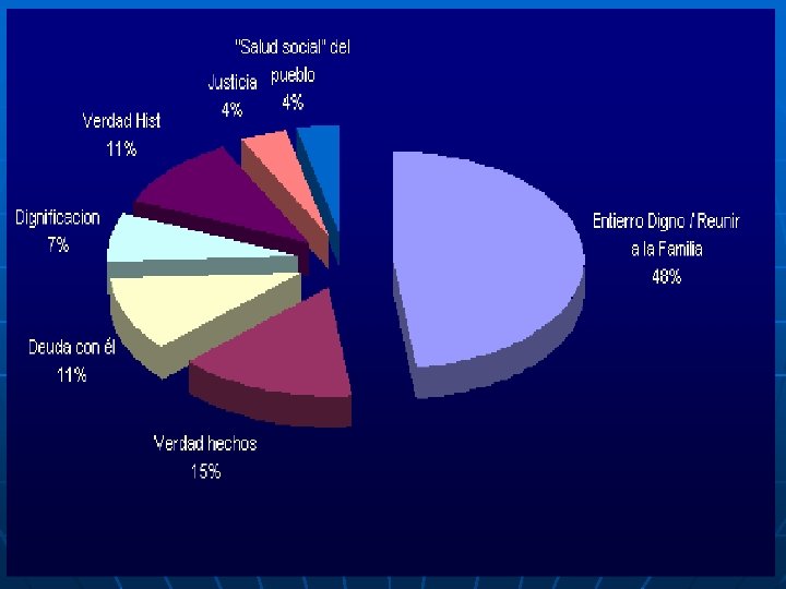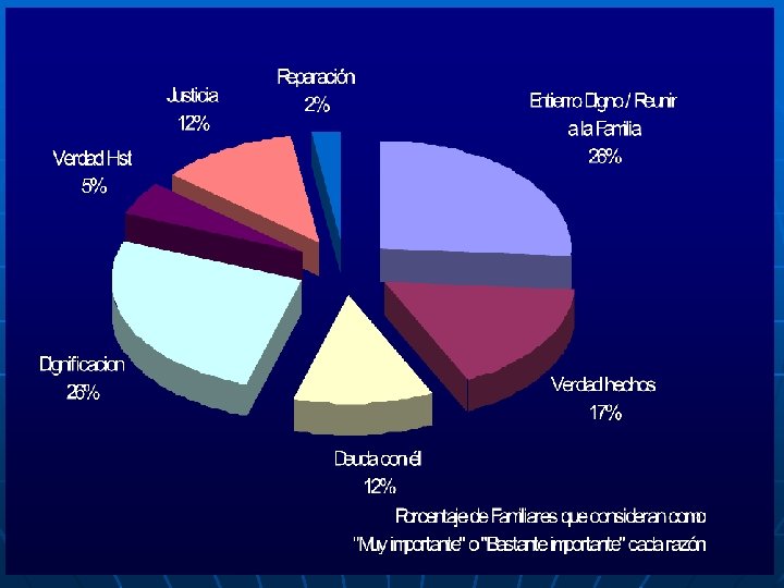 Razones sugeridas n n Resultados no cambian sustancialmente. 83% se relacionan con aspectos emocionales o de vínculo con el asesinado 9% con el contexto más amplio Respuestas no eran mutuamente excluyentes: no es necesario elegir entre las razones emocionales o las sociales y políticas en la búsqueda del familiar