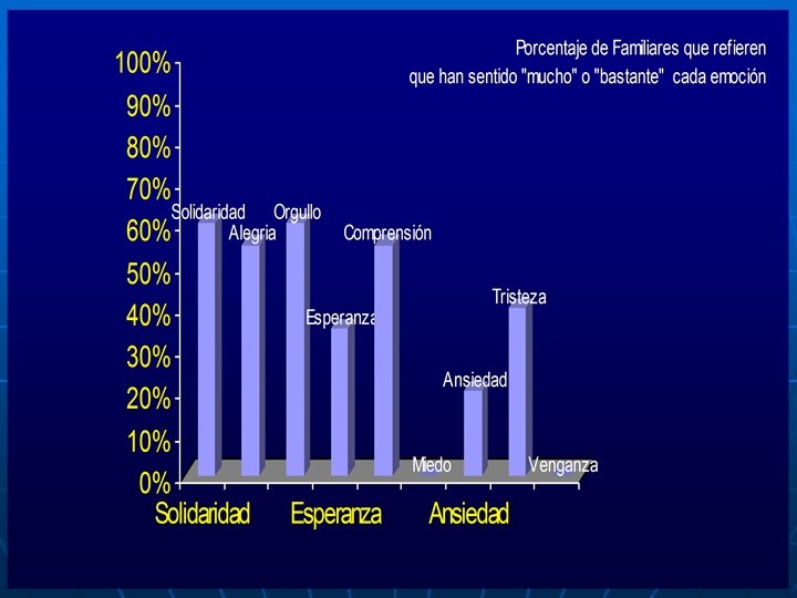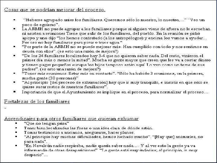 Emociones vividas durante el proceso. n n n • • • n • Emociones que se han movido durante la excavación entre los familiares. Respuestas no son mutuamente excluyentes: posible al tiempo emociones positivas y negativas. Positivas en la gran mayoría de casos Solidaridad y Orgullo 60% Alegría y Comprensión 55% Esperanza 35% Negativas: 40% Tristeza 20% Ansiedad. No hay casos en que se refiera Miedo, Vergüenza, Rabia, Rencor o Deseos de Venganza. Ausentes en todos los entrevistados como sentimientos relevantes