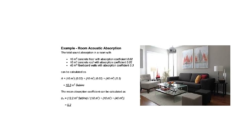The sound absorption coefficient indicates how much of the sound is absorbed in the actual material. The absorption coefficient can be expressed as: α = Ia / Ii (1) where Ia = sound intensity absorbed (W/m 2) Ii = incident sound intensity (W/m 2) Concrete block, coarse 0. 3 ‐ 0. 4 Concrete block, painted 0. 05 ‐ 0. 07 Cork sheet, 6 mm 0. 1 ‐ 0. 2 Fiberboard on battens, 12 mm 0. 3 ‐ 0. 4 Floor, concrete or terrazzo 0. 02 Floor, linoleum, asphalt, rubber or cork tiles on concrete 0. 03 Floor, wood 0. 06 ‐ 0. 1 Hardwood 0. 3 Glass, large panes heavy plate 0. 03 ‐ 0. 05 Glass, ordinary windows 0. 1 ‐ 0. 2 Gypsum board, 12 mm 0. 04 ‐ 0. 07 Mineral wool, 100 mm 0. 65 Persons, each 2. 0 ‐ 5. 0 Plaster walls 0. 01 ‐ 0. 03 Plywood panel, 3 mm 0. 01 ‐ 0. 02 Polystyrene, expanded on 50 mm battens 0. 35 Polystyrene, expanded rigid backing 0. 15 Polyurethane foam, flexible 0. 95 Rubber sheet, 6 mm porous 0. 1 ‐ 0. 2 Slag wool or glass silk, 50 mm 0. 8 ‐ 0. 9 Snow 0. 75 Wood wool cement on battens, 25 mm 0. 6 ‐ 0. 07