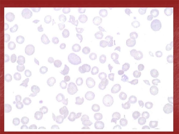 Red cell fragmentation syndromes: These arise through physical damage to red cells either on n abnormal sufaces (e. g. artificial heart valves) or n microangiopathic hemolytic anemia caused by red cells passing through fibrin strands deposited in small vessels due to DIC or n passing through damaged small vessels in malignant hypertension, the hemolytic uremic syndrome or meningococcal sepsis. n Blood film shows many red cell fragments.