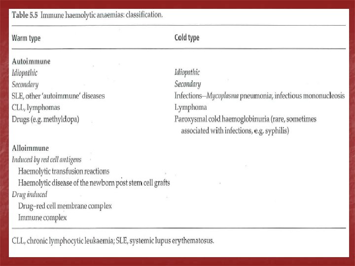 n n n Clinical features: the disease can occur at any age in both sexes & presents as a hemolytic anemia of variable severity. The spleen is often enlarged. It is classified as: Idiopathic Secondary to autoimmune disoders, lymphoma, CLL, drugs