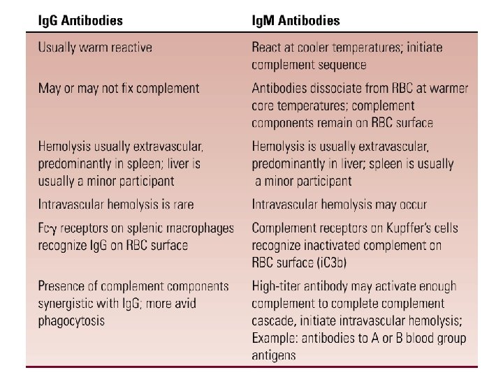 Pathophysiology • The antibody is usually a “panagglutinin, ” meaning that the patient’s antibody will react with virtually all RBCs • The antibody is almost always an Ig. G. Occasionally, an Ig. A or Ig. M antibody will be seen • The antibody often fixes complement to the red cell but usually does not proceed through the complete membrane attack complex • Occasionally, there is sufficient complement activation on the RBC, resulting in formation of the membrane attack complex and intravascular hemolysis • Red cell destruction is primarily by phagocytosis by splenic macrophages