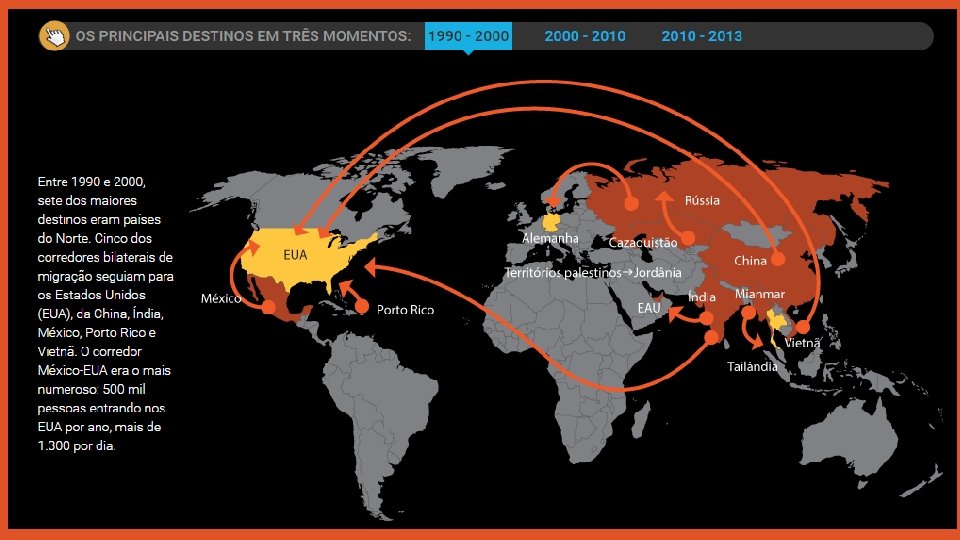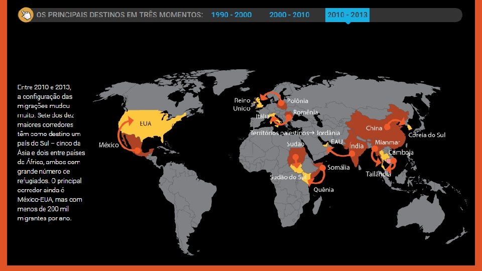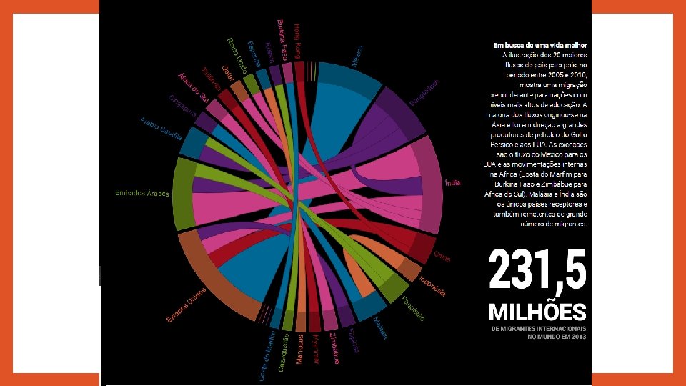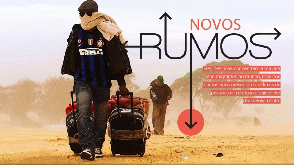 231 milhões de migrantes • O total de migrantes internacionais no mundo chegou a 231, 5 milhões de pessoas em 2013, segundo a ONU. • Esse número engloba qualquer pessoa que viva em um país diferente daquele em que nasceu; • Nos últimos anos, algumas das principais rotas de migração mudaram de forma significativa, • Países em desenvolvimento (Brasil, México ou Catar) estão atraindo bem mais pessoas do que antes; • Entre 1990 e 2000, sete dos dez maiores destinos de migração eram países desenvolvidos (chamados genericamente de Norte), de 2010 a 2013 a situação se inverteu, com os países em desenvolvimento (o Sul) ocupando sete posições na lista. Norte Sul Europa América Latina América do Norte (exceto México) África Japão Ásia (sem Japão) Austrália Oceania Nova Zelândia