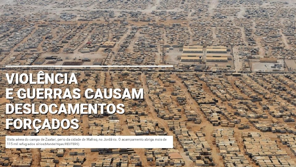 Migrações forçadas • Pessoas são obrigadas a ir para longe de seus lares contra a vontade, para escapar de uma perseguição religiosa ou política, de uma guerra, de violações a seus direitos humanos ou de calamidades naturais, como terremotos. O total se divide da seguinte forma: • 16, 7 milhões de refugiados: pessoas que fugiram para outro país, onde receberam asilo; • 33, 3 milhões de deslocados internamente: pessoas que não saíram das nações em que nasceram; • 1, 2 milhão de solicitantes de asilo: que ainda estão esperando.