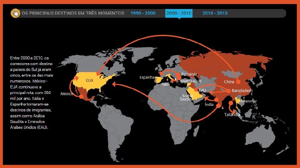 Crise econômica • Destinos anteriormente pouco importantes na rota das migrações passaram a atrair milhares de pessoas; • Países produtores de petróleo no Golfo Pérsico, por exemplo, empregam muitos homens em áreas como a construção civil. Com isso, os estrangeiros são agora a grande maioria da população nos Emirados Árabes Unidos e no Catar; • O México, entre 2000 e 2010, quase dobrou o número de imigrantes legais no país; • Muitos mexicanos que viviam há anos EUA regressaram; • Motivo principal para o retorno é também um dos fatores que explicam o crescimento da migração para países em desenvolvimento: a crise econômica global, que em 2008 atingiu com mais força os países ricos;