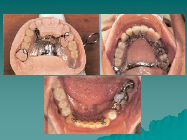Co/Cr Partial denture u Co/Cr PD allows the prosthesis to incorporate both strength and rigidity Such a denture may utilise these properties to obtain its support and retention from the natural teeth. When cast in thin sections it may be of sufficient flexibility to make use of undercuts in thick sections its rigidity will resist deformation. u Indications: good oral hygiene and high patient motivation to accept a prosthesis. Where there is a wide distribution of abutment teeth which have adequate support and the clinician wishes to derive the support from the teeth.