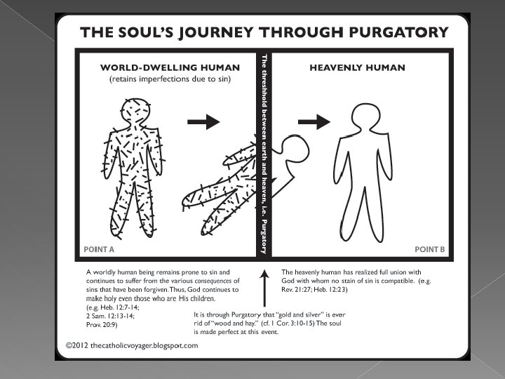 Church Suffering � The souls of all those who die in a *state of grace* but who are *imperfectly purified/sanctified* at the time of death are in Purgatory. � Purgatory is better thought of as a state rather than a place. It’s a state of purification. Think of it as the completion of the process of becoming holy here on Earth.