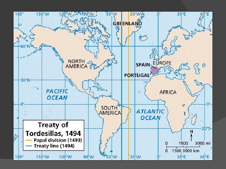 Line of Demarcation � 1493: Pope Alexander VI drew a line of demarcation dividing Portuguese and Spanish possessions � Portugal � 1494: objected Treaty of Tordesillas, moved the line further west