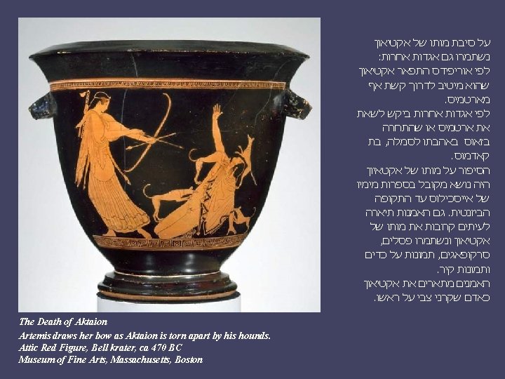 Seneca, Oedipus 751 ff (trans. Miller) (Roman tragedy C 1 st A. D. ) : "What of the doom of Cadmus' grandson, when the antlers of the long-lived stag covered his brow with their strange branches, and his own hounds pursued the master? Headlong from the woods and mountains the swift Actaeon fled, and with feet more nimble, scouring glades and rocky places, shuddered at the feathers fluttering in the breeze, and avoiding the snares he himself had set; at length he gazed into the still pool’s water and saw his horns and his beast-like countenance. 'Twas in tha same pool the goddess [Artemis] of too stern chastity had bathed her virgin limbs!" Artemis draws her bow as Aktaion is torn apart by his hounds. Attic Red Figure, Bell krater, ca 470 BC Museum of Fine Arts, Massachusetts, Boston, USA