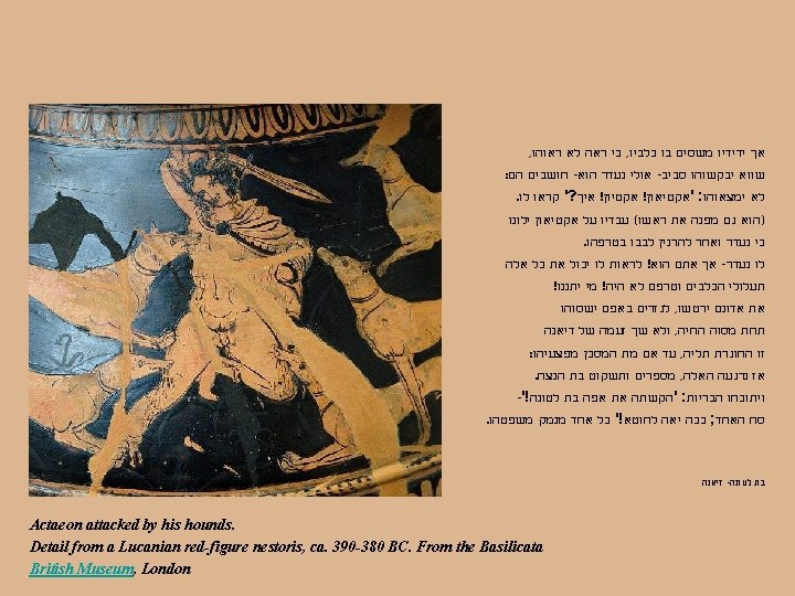 Diodorus Siculus, Library of History 4. 81. 3 - 5 (trans. Oldfather) (Greek historian C 1 st B. C. ) : "Aktaion, who, as the myths relate, was torn to pieces by his own dogs. The reason for this bad turn of fortune of his, as some explain it, was that, presuming upon his dedication to Artemis of the first-fruits of his hunting, he purposed to consummate the marriage with Artemis at the temple of the goddess, but according to others, it was because he represented himself as superior to Artemis in skill as a hunter. But it is not incredible that it was for both these reasons that the goddess became angry; for whether Aktaion made an improper use of the spoils of his hunting to satisfy his own desire upon her who has no part in marriage, or whether he was so bold as to assert that as a hunter he was to be preferred above her before whom even gods withdraw from rivalry in the chase, all would agree that the goddess was justified in having become indignant at him. And, speaking generally, we may well believe that, when he had been changed into the form of one of the animals which he was wont to hunt, he was slain by the gods which were accustomed to prey upon the other wild beasts. " Actaeon devoured by his dogs. Attic white-figure lekythos, ca. 480– 470 B. C. , National Archaeological Museum of Athens
