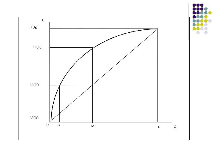 Determinación de la función de utilidad (cont) l l l Ahora se puede cambiar el valor de uno de los premios (0 ó 1, 000) por $600. 000 y de manera similar encontrar el valor intermedio; repitiendo este proceso se pueden encontrar varios puntos de la función de utilidad y dibujar la curva correspondiente. Es decir, si se cambia $1. 000 por $600. 000, se obtendrá un valor determinado T, tal que, 0 T 600. 000 y que hace indiferente al individuo frente a la nueva lotería. Entonces para ese T que hace indiferente al individuo entre ese valor y la nueva lotería ($600. 000 con p = 0, 5 y $0 con p = 0, 5), la utilidad será: U(T) = 0, 5 x U(0) + 0, 5 x U($600. 000) = 0, 5 x 0 + 0, 5 x 50 U(T) = 25