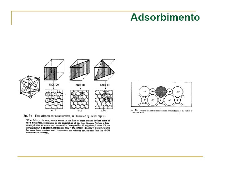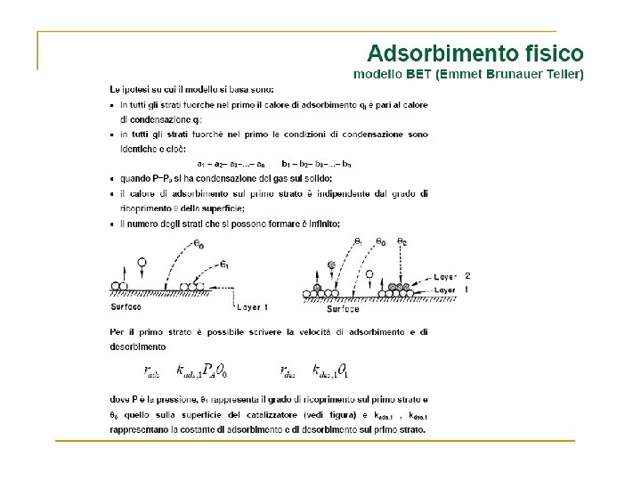 Adsorption and Reaction at Surfaces Adsorption PHYSISORPTION CHEMISORPTION WEAK, LONG RANGE BONDING Van der Waals interactions (e. g. London dispersion, dipole-dipole). . STRONG, SHORT RANGE BONDING Chemical bonding involving orbital overlap and charge transfer. NOT SURFACE SPECIFIC Physisorption takes place between all molecules on any surface providing the temperature is low enough. SURFACE SPECIFIC Marked variation between crystal planes E. g. Chemisorption of hydrogen takes place on transition metals but not on gold or mercury. Hads = 5 …. . 50 k. J mol-1 Related to factors like molecular mass and polarity (i. e. ~ heat of liquefaction) Hads = 50 …. . 500 k. J mol-1 Wide range (related to the chemical bond strength) Non activated with equilibrium achieved relatively quickly. Increasing temperature always reduces surface coverage. Can be activated, in which case equilibrium can be slow and increasing temperature can favour adsorption. No surface reactions. Surface reactions may take place: - Dissociation, reconstruction, catalysis. MULTILAYER ADSORPTION BET Isotherm used to model adsorption equilibrium. MONOLAYER ADSORPTION Langmuir Isotherm used to model adsorption equilibrium. .