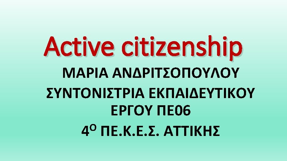 EDUCATION AND ACTIVE CITIZENSHIP Education nowadays should be an education against poverty, social exclusion, racism, discrimination. Citizenship is related to rights (civil, political & social) and participation. So active Citizenship concerns all of us and it is positively correlated with education. In the European context, Active Citizenship has been promoted within the education as a tool to support the continuation of democracy, human rights and greater social inclusion. So, it`s about education for peace, intercultural approach, concepts of democratization, participation.