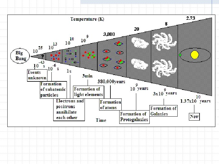 The Ultimate Evidence? Radiation from the big bang should still be detectable from hot gas formed just after the bang. About 3000 K (near IR). However, this light has a redshift of 1000! Therefore, its observed wavelength and temperature would be about 1000 times larger. Expected about 3 K (microwave). Arno Penzias and Robert Wilson detected this in the mid-sixties: about 2. 7 K! Now called the cosmic microwave background radiation. Seen in all directions! 1978 Nobel Prize