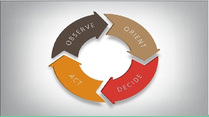 ● Boyd’s circle- Air Force Colonel who defined human decision making and called it the OODA loop. Any break in this loop will reset you to the beginning. ○ OBSERVE - everyone must take inventory of their situation ○ ORIENT - plans evaluated, weighed, and selected ○ DECIDE - course of action decided ○ ACT - a plan is implemented ● After the plan is complete you automatically begin to observe the results and the loop resets.