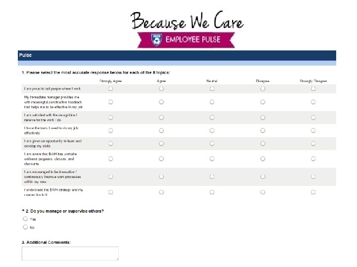 You Matter to Us. What Matters to You? Tell us by taking BWH’s employee pulse survey today! The anonymous eight-question survey will take less than five minutes to complete. Human Resources is committed to sharing the results and quickly identifying areas for improvement in order to make BWH an even better place to work. After you complete the survey, you will be taken to a new page to enter into a raffle if you wish.