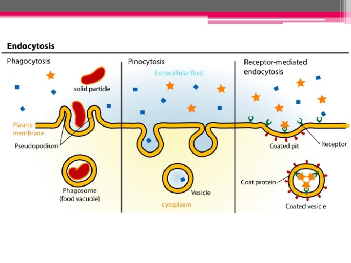 Endocytosis, continued … • Pinocytosis & Phagocytosis • Pinocytosis: cells take up dissolved molecules by engulfing small volumes of the external solution. Ex: small intestine and fat droplets • Phagocytosis: process by which cells engulf solid particles. Ex: white blood cells and microbes • Cellular drinking vs. cellular eating