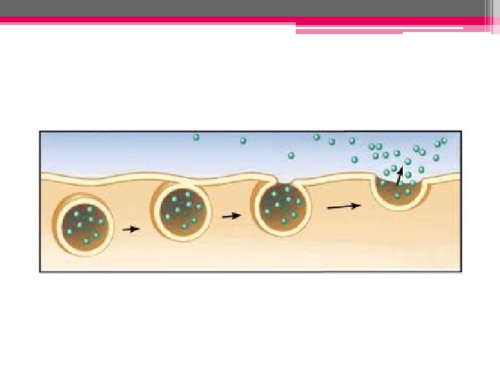 Exocytosis • Process by which large molecules held within the cell are transported to the external environment • Waste materials are often released this way • Useful materials, like transmitter chemicals emitted from nerve cells are also released by exocytosis