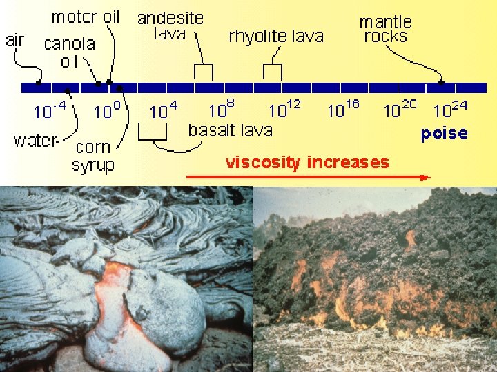 The three major magma/lava types are largely classified based on silica content and to a lesser extent the other common elements. Note the relationship between Si. O 2 content and Fe. O and Mg. O content of the respective magma types. The silica content and temperature of the lava plays a significant role in its viscosity properties.