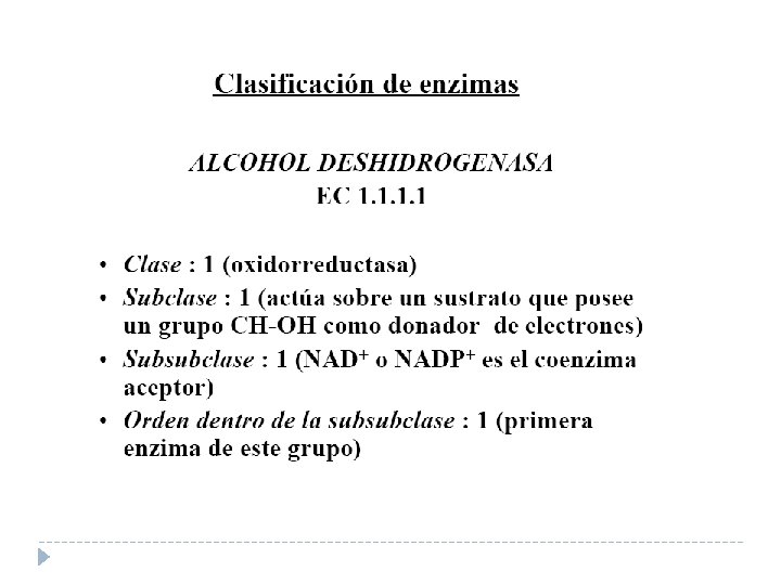 Clasificación Internacional de las Enzimas Óxido – Reductasas (reacciones de oxido- reducción) Actúan sobre ": CH – OH " Actúan sobre ": C = O " Actúan sobre ": C = CH – " Actúan sobre ": CH – NH 2 " Actúan sobre ": CH – NH – " Hidrolasas (reacciones de hidrólisis) Esteres Enlaces glucosídicos Enlaces pepsídicos Otros enlaces C – N Anhídridos de ácido Transferasas (transferencia de grupos funcionales) Grupos de un átomo de C Grupos aldehídos o cetónicos Grupos acilos Grupos glucosilos Grupos fosfatos Grupos que contienen azufre