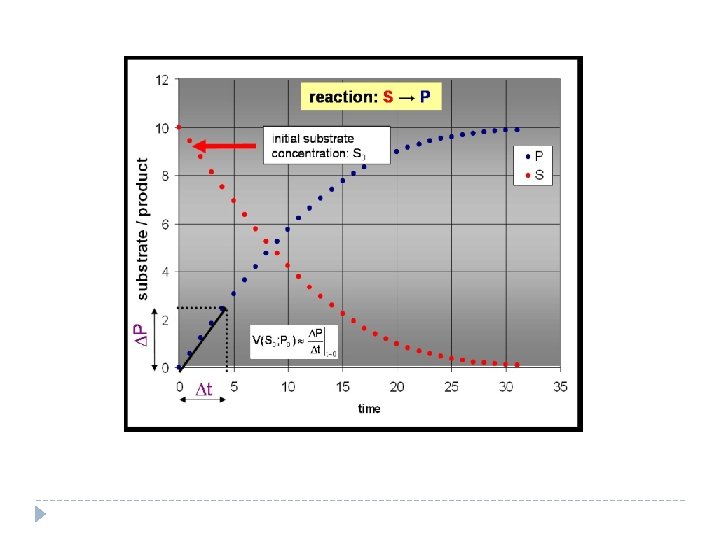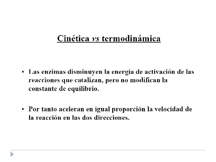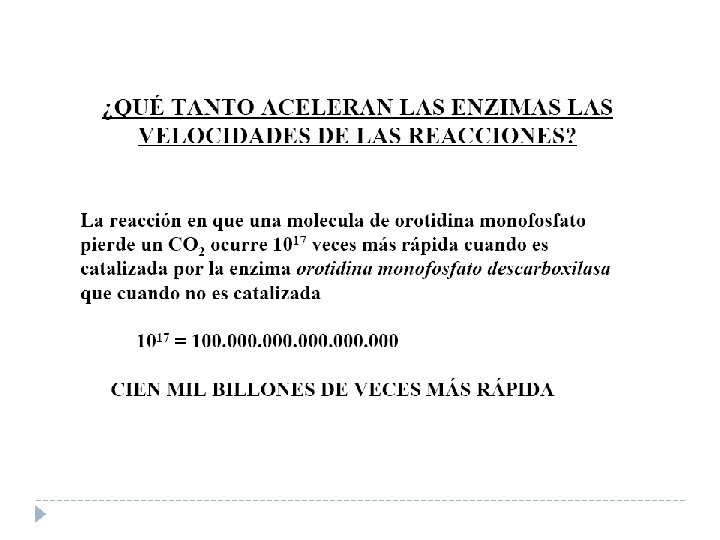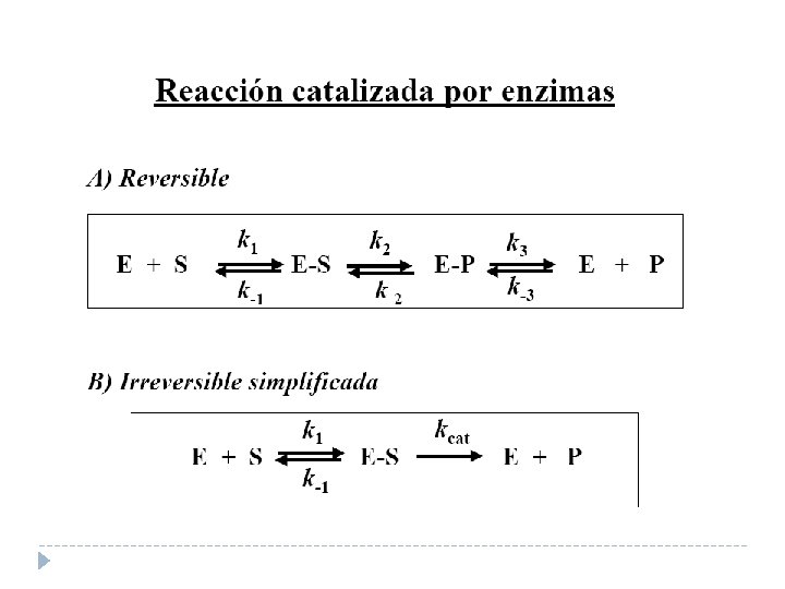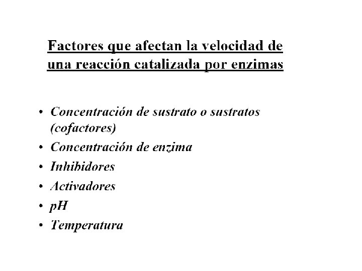 Velocidad inicial de una reacción Ocurre en los primeros minutos de la reacción, en donde existe una relación lineal que se mantiene cuando el consumo del sustrato no va más allá del 5% de la concentración inicial. Los cambios en la linealidad de la reacción pueden deberse a una o varias causas: El decremento en la concentración de sustrato La desnaturalización de la enzima La inhibición causada por el producto de la reacción