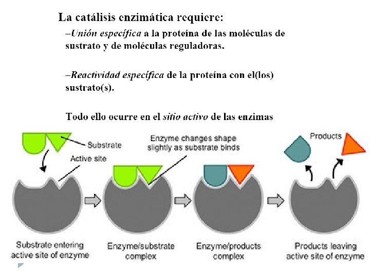 Ajuste inducido D. Koshland, 1958 El sustrato al unirse al sitio activo de la enzima, lleva a un movimiento conformacional de la enzima para que al unirse ambos se lleva a cabo la catálisis