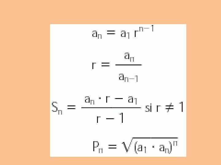 Una progresión geométrica se cumple, por definición, que el término que ocupa el lugar n será siempre igual al anterior por la razón r es decir para todos los valores de n = 2, 3, 4, . . . En consecuencia se tendrá Por consiguiente se cumplirá que, para cualquier n :
