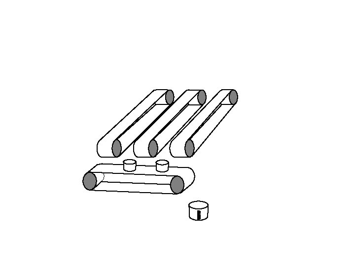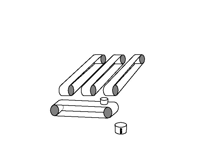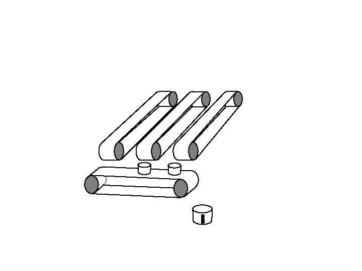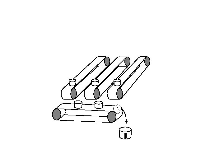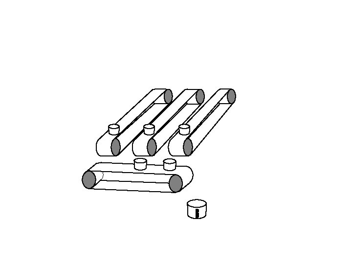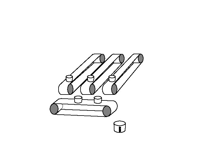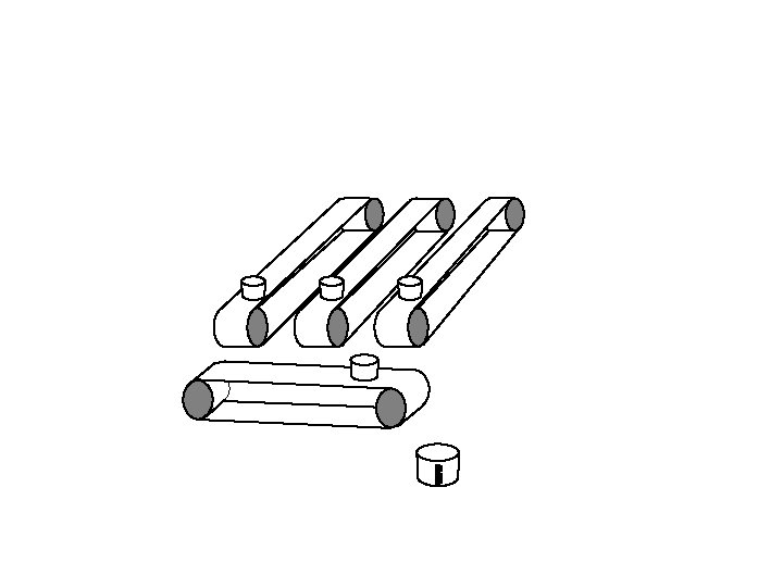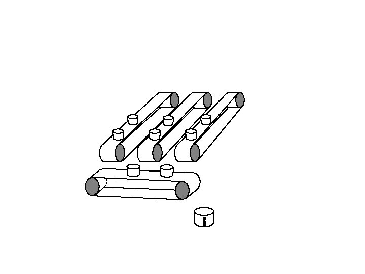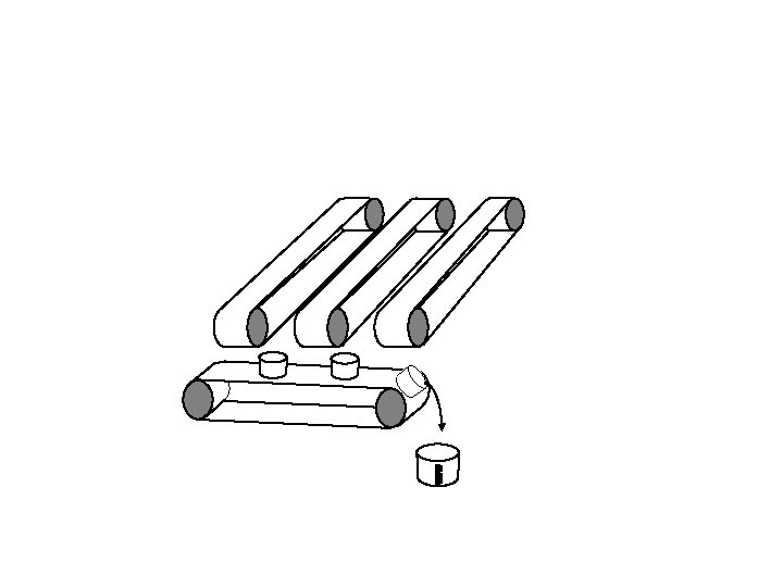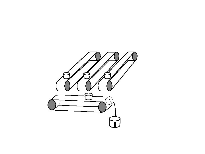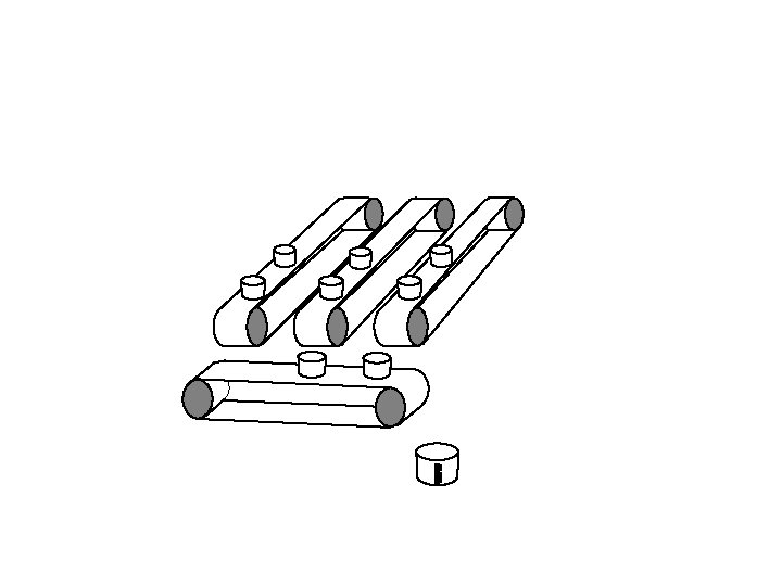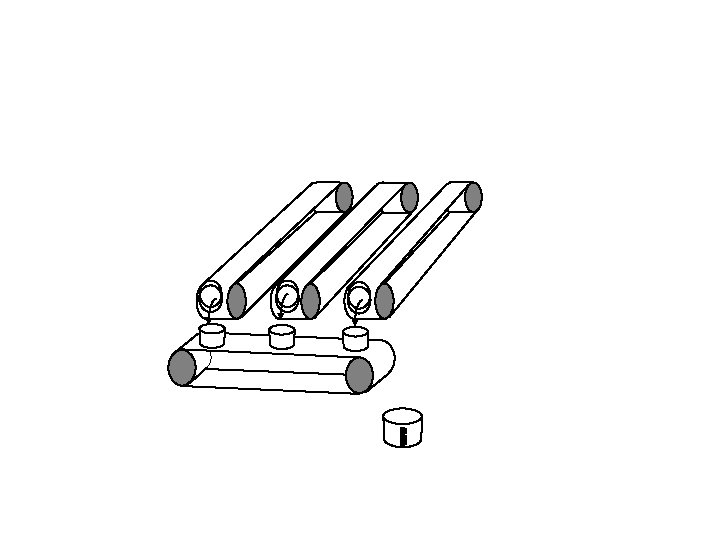 Vertical conveyor stops. Horizontal conveyor starts up and tips each bucket in turn into the measuring cylinder.