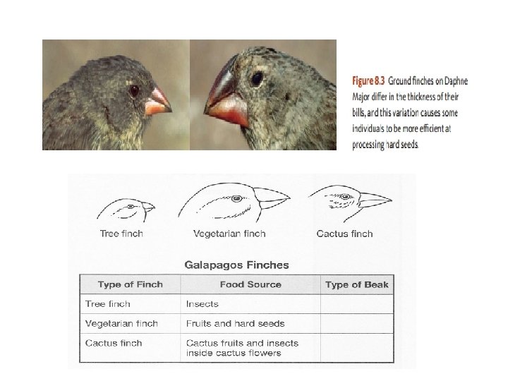 Food resources on each island • The variation seen in the finches on each island is due to the food sources available on each of the islands. • Each island has available certain types of food sources which require a different shape and size of beak in order to retrieve food. • Therefore, depending on the food source available on a given island, the finches will have a specific beak shape and size.
