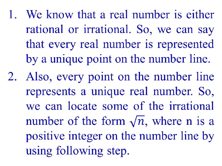 Result Any irrational number can be represented on the number line by using this method.