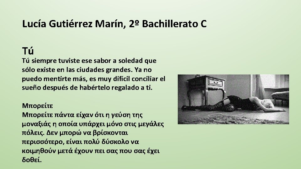 Celia Domínguez de Sarriá, Primero de Bachillerato B Wechsel Ich bin hier, in einem Wald. Ich kann den Mond oder die Sonne nicht sehen. Es gibt Krieg und Tod . Viele unschuldige Menschen und Träume sterben lautlos. Es gibt kein Vertrauen oder Erbarmen. Alles wird dunkel. Ich bin die nächste. . . Plötzlich sehe ich etwas in der Ferne: ein Licht. Gleichkeit, Wahrheit, Menschlichkeit, Frieden. . . Ich gehe hin. Dann erfüllen mich positive Gedanken. Wir sind nicht schuldig daran Menschen zu sein. Keine Wissenschaft kann sagen, was das Leben ist. . . Ich schaue in den blauen Himmel. Zum ersten mal lächle ich. . .