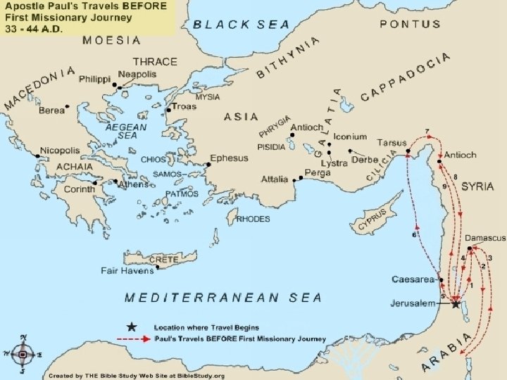 Saul of Tarsus Activities from Conversion to Acts 13 • He preaches the gospel in Damascus (9: 19 -22) • He travels to Arabia (Galatians 1: 13 -17) • He returns to Damascus, eventually needing to escape the Jews’ attempt to kill him (9: 23 -25) • He visits Peter and James the Lord’s brother in Jerusalem (9: 26 -27; Galatians 1: 18 -19) • When Grecian Jews in Jerusalem plot to kill him, the brethren take him to Caesarea from where he sails to Tarsus (9: 28 -30) • He remains in Tarsus until Barnabas comes to bring him to Antioch (11: 25 -26) • He and Barnabas carry relief to the saints in Jerusalem about the same time James is killed, Peter is imprisoned, and Herod Agrippa dies (11: 30— 12: 1)