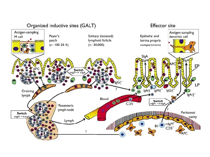 În alţi termeni, acest fapt înseamnă analiza corectă de către macrofage a naturii stimulului antigenic, fie el bacterian sau alimentar, informaţie prezentată la nivelul polului bazal al celulelor devenite imunocompetente: enterocitele activate şi celulele M, acestea din urmă “coafând” nodulii limfoizi grupaţi sub numele de placa Peyer şi de care va depinde răspunsul imunitar ulterior.