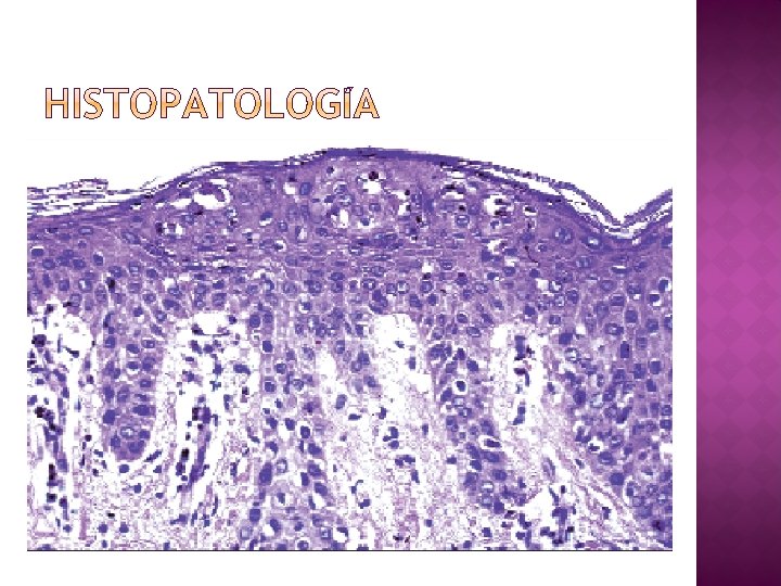 Epidermis con edema intracelular. Grado variable de queratinocitos apoptóicos. Exocitosis eosinofílica en grado variable, edema y vasodilatación de capilares de dermis. Fases avanzadas: hiperqueratosis e hipergranulosis. Infiltrado de células mononucleadas de mediana intensidad.