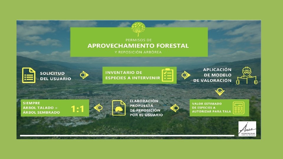 PLAN INTEGRAL DE REPOSICIÓN ARBÓREA ¿Cómo se hará con la aplicación del modelo de valoración? REPOSICIÓN MÍNIMA: Reposición 1: 1 (Reposición mínima MADS) Sólo podrán ser aprobadas con las coordenadas de su localización y aprobación del municipio receptor para el caso de espacios públicos. MEDIDAS ADICIONALES A LA REPOSICIÓN: ü Generación de nuevos sitios de siembra, a través de la eliminación o extracción de tocones ü Conversión de pisos duros a suelo verde y recuperación de la cobertura vegetal en el espacio público ü Ejecución de actividades complementarias como mantenimiento de árboles juveniles, diseño e implementación de pasos de fauna, entre otras. ü Restauración ecológica en áreas periurbanas. ü Adquisición y entrega de inmuebles para la generación de nuevo espacio público verde ü Pago del valor remanente cuyo recaudo irá al Fondo Verde Metropolitano