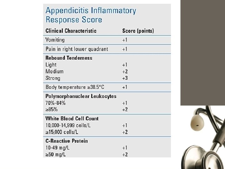 Clinical features • Signs: 1. Pyrexia 2. Localized tenderness in RIF 3. Muscle guarding 4. Rebound tenderness 5. Rovsing’s sign 6. Dunphy sign 7. Psoas sign 8. Obturator sign