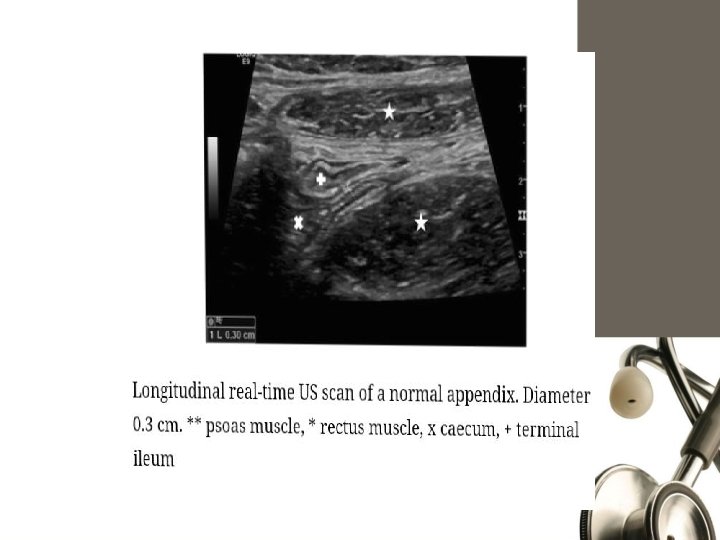 Abdominal XRay • Fecalith • loss of psoas shadow • distention of SB loop or cecum • air under diaphragm