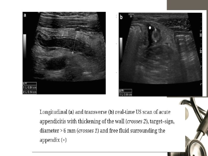 Graded Compression U/S Blind ending nonperistaltic bowel loop. Non compressible. Thickened wall>3 mm, lumen >6 mm. Presence of periappendicular fluid. Target sign. Appendicolith.