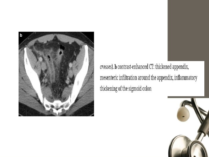 computed tomography (CT) scan - Appendix dilated and the wall is thickened. Periappendiceal phlegmon, and free fluid Periappendiceal fat stranding Thickened mesoappendix Fecaliths but their presence is not pathognomonic of appendicitis.