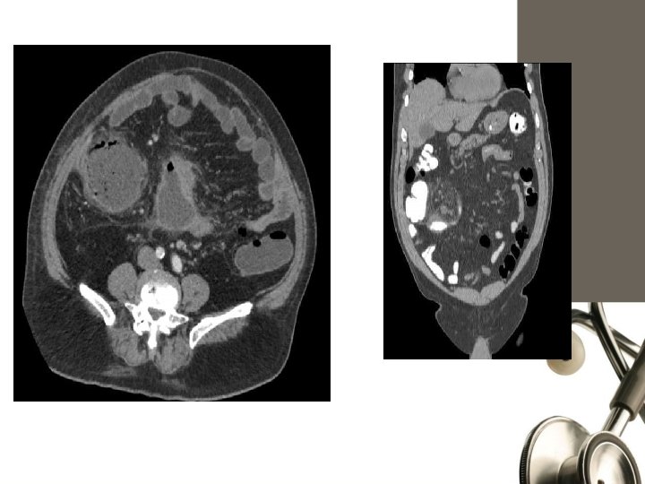Computed Tomography • Rational use: - Elderly - Atypical presentations - Neoplasms - Acute diverticulits - Intestinal obstruction • MRI: ? ?