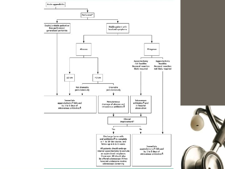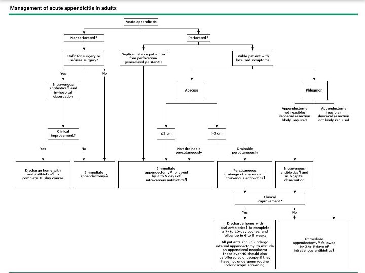 Management of Appendicular mass • Late presentation • Clinically mass & fever, Confirm by CT or US • Admit, Labs, NPO if not vomiting, NG if vomiting, Fluids Antibiotics (Broad spectrum: cefriaxone and metronidazole) Monitor Vitals q 4 Hrs • Tx: Conservative mgt(Oschner Sherren’s Regime) After 24 -48 Hrs: Improvement (less pain, no vomiting no fever, bowel motion)