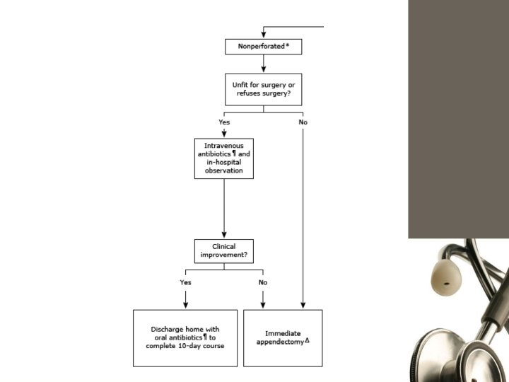 No improvement: Vomiting, tachycardia, fibrile, incrase size of mass 2 possibilities: 1. Bowel obstruction by adhesions 2. Mass became abscess, confirm by CT, tx by CT guided percutaneous drainage and antibiotics