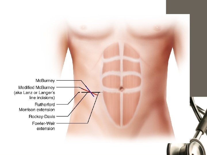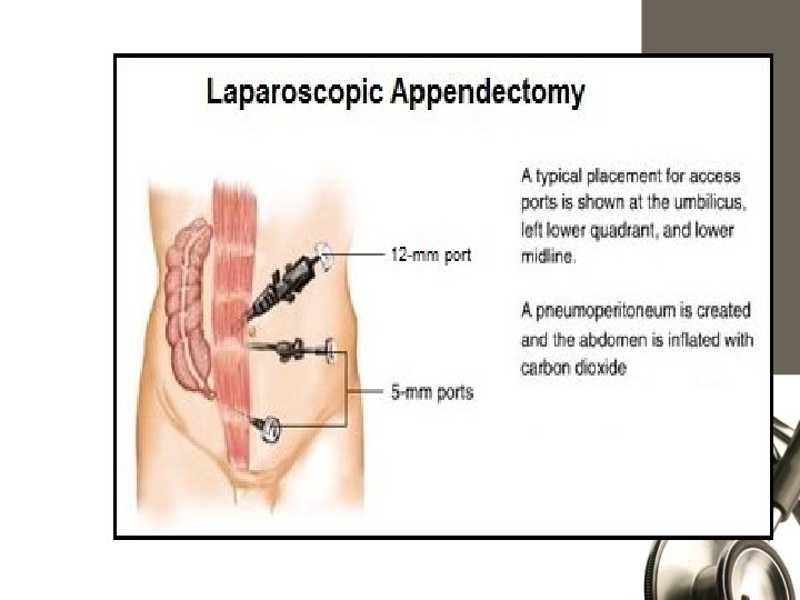 OPERATIVE INTERVENTIONS FOR THE APPENDIx Open Appendectomy Laparoscopic Appendectomy General Anesthesia A right lower quadrant incision at Mc. Burney’s point with A Mc. Burney (oblique) or Rocky-Davis (transverse) right lower quadrant muscle splitting incision If perforated appendicitis is suspected or the diagnosis is in doubt, a lower midline laparotomy can be considered Typically uses three ports. Typically, a 10 - or 12 -mm port is placed at the umbilicus, whereas two 5 -mm ports are placed suprapubic and in the left lower quadrant. Inc risk for surgical site infection Inc risk Of intra abdominal abscess Decreased operative duration less pain, shorter length of stay, and quicker return to normal activity