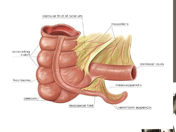 • Position: constant at the confluence of the 3 taenia coli of caecum • Mesoappendix: Arises from the lower surface of the mesentery of terminal ileum • Appendicular Artery: Branch of Ileo-colic artery – End Artery (pass through mesoappendix) • 04 -06 Lymphatic channels traverse Mesoappendix ----> Ileo-caecal LNs • Innervation : Superior mesenteric plexuses T 10 -L 1 and vagus nerve
