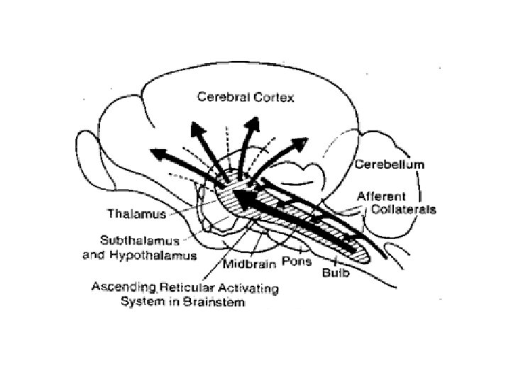 • Generation of conscious state depend on activity of a part from the reticular formation of brain called the ascending reticular activating system (A. R. A. S) of midbrain. • A. R. A. S terminated proximally in the non-specific thalamic nuclei (intra-laminary & midline thalamic nuclei) which project, in turn, non-specifically to the cerebral cortex. • Activity of this system act to generate a state of desynchronizations in cerebral cortex, which is necessary for execution of sensory perceptions & generation of consciousness.